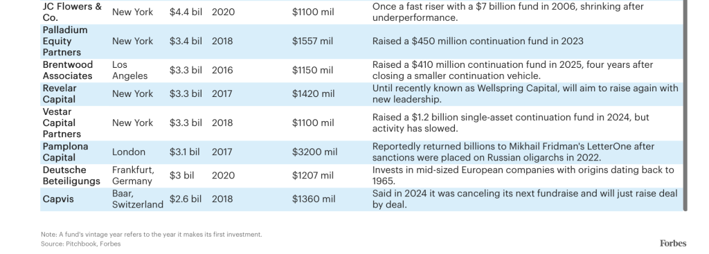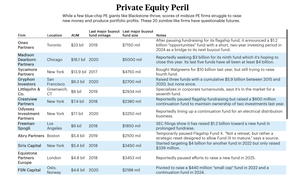 Many of the zombies on our list, like Vestar, Palladium Equity, Brentwood Associates, Revelar Capital and Norwegian firm FSN Capital, have raised continuation funds in the last two years. Onex is said to be gathering $1.6 billion to explore this route. Evercore’s private capital advisory group reported that continuation funds, which carry lower management fees, raised $62 billion in 2024 and more than $40 billion in the first half of 2025, up from nearly nothing a decade ago.