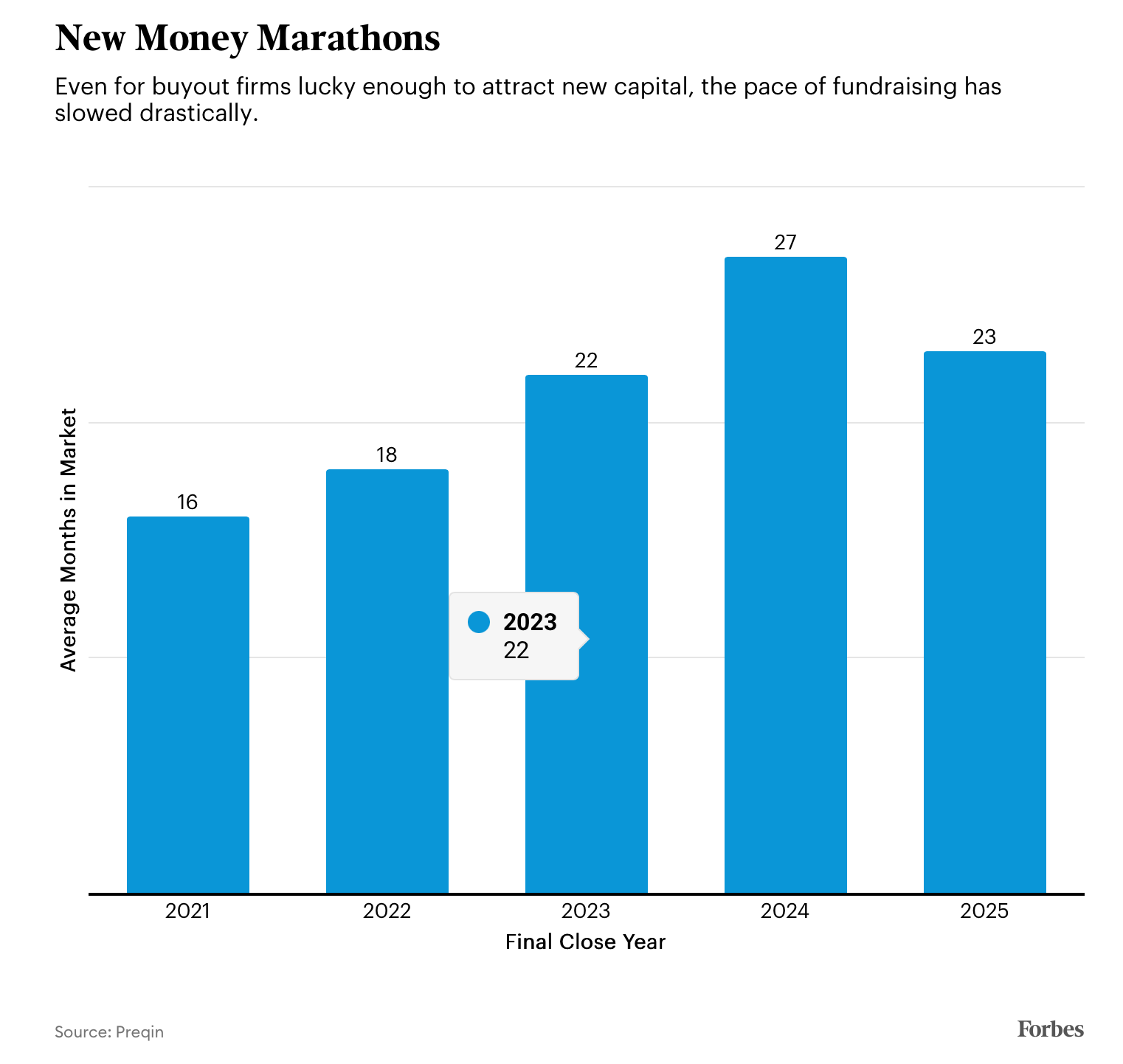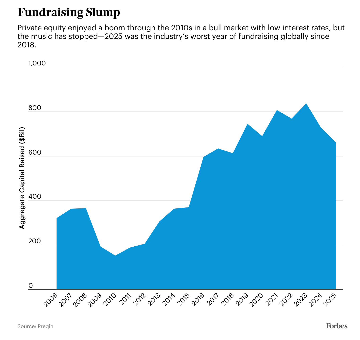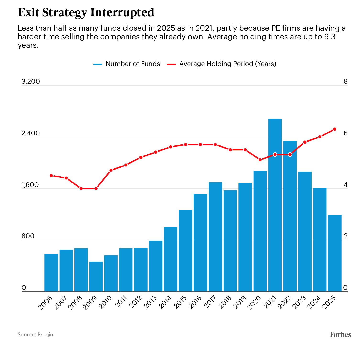 Data from private equity analytics firm Preqin shows that the average fund that closed in 2025 spent 23 months in the market fundraising, up from 16 months in 2021, and fewer funds are meeting their fundraising goals at all. In 2025, a total of 1,191 buyout funds raised $661 billion, down from 2,679 funds and $807 billion in 2021. Blue-chip megafunds continue to attract capital, bucking the trend. Thoma Bravo raised $24.3 billion in its 16th flagship fund last year, Blackstone closed on a $21.7 billion fund and Veritas Capital raised $14.4 billion. Veritas’ billionaire CEO, Ramzi Musallam, told Forbes that consolidation is favoring high performers, adding that “a lot of funds that exist today won’t necessarily exist five years from now.”